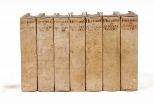 7 vol. in-12, vélin ivoire, sur les plats encadrement de filets à froid avec fleurons aux angles internes et médaillon central à froid, titre manuscrit au dos, tranches granitées, [Rel. de l'époque], très légèrement salie.