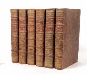 6 vol. pet. in-folio, veau moucheté, dos à nerfs orné de motifs dorés, pièces de titre et de tomaison acajou, [Rel. de l'époque], un vol. dégradé par l’humidité, avec coin manquant.