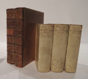• VIRGILE. P. Virgilii Maronis Opera, in tres tomos divisa. Leyde, Jacob Hackius, Abraham Wolfgang, 1680 ; 3 forts vol. in-8, vélin ivoire, passants apparents en mors, dos lisse avec titre manuscrit, [Rel. de l'époque].
