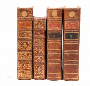 • Itinéraire complet de la France, ou Tableau général de toutes les routes et chemins de traverse de ce royaume ; auquel on a joint l’Itinéraire des Pays-Bas, & la direction des routes aux villes capitales des royaumes qui avoisinent la France. Paris, Louette, 1788 ; 2 vol. in-8, demi-basane granitée, dos à nerfs orné, pièce de titre corail et de tomaison noire, [Rel. de l'époque], plats frottés.