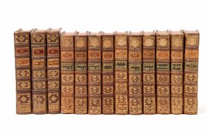 10 (sur 15) vol. in-12, veau granité, dos à nerfs orné de motifs dorés, pièces de titre marron et de tomaison verte, [Rel. de l'époque], quelques petits accrocs aux coiffes.