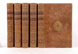 5 vol. in-folio, veau marbré, trois filets dorés en encadrement, armes royales dorées au centre des plats, dos à nerfs orné de motifs dorés, pièces de titre et de tomaison rouges, [Rel. de l'époque], quelques petits manques de matière à certains plats.