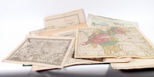 - Carte de France, par Guillaume Delisle, 1721, rehaussée à l’aquarelle. Petite déchirure à la pliure (62 x 49 cm).