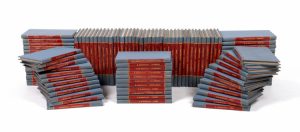 100 vol. pet. in-12, bradel toile bleu acier, pièce de titre de maroquin à long grain grenat, [Rel. de l'époque].
