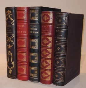 • TAINE (Henri). Voyage aux Pyrénées. Troisième édition illustrée par Gustave Doré. Paris, Hachette, 1860 ; gr. in-8, demi-chagrin grenat, dos à nerfs orné de motifs dorés, tête dorée, non rogné, [Petit, succr. de Simier].