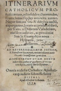 L’Itinerarium catholicum est un ensemble de textes composés par l’auteur durant ses années au service de l’Église. À la mort de Foucher, ceux-ci furent compilés et publiés par Diego Valadés (1533-1582 ?), frère franciscain polyglotte et versé dans la linguistique indienne. Les premiers chapitres du livre décrivent les procédés pour la conversion des Mexicains, comme le baptême et le mariage. Les feuillets 94-99 contiennent la description d’un baptême. Les feuillets 79v°-93v° sont consacrés à la conversion difficile des Chichimecs (Chichimèques), peuples semi-nomades et belliqueux vivant dans le nord du pays et avec qui les conquistadores espagnols eurent de nombreux démêlés.