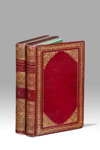 2 volumes in-8, maroquin rouge à long grain, bordure dorée encadrant les plats, écoinçons, dos lisse orné, bordure intérieure, doublure et gardes de moire verte, tranches dorées (Bozérian jeune).