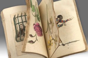 TRES RARE SPECIMEN DE « LIVRE MAGIQUE », recueil de 168 figures gravées en taille-douce et coloriées au pinceau, formant 7 séries sur divers thèmes : arlequin, abbés et religieux, militaires, fleurs, cartes à jouer, etc.