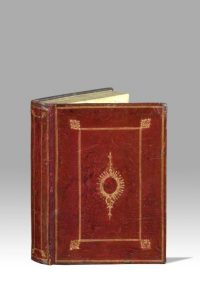 In-4, maroquin rouge, double encadrement de deux filets dorés, petit fer aux angles, cartouche central de forme ovale dessiné aux petits fers avec réserve au milieu, dos lisse orné de même, tranches mouchetées de rouge (Reliure de l’époque).