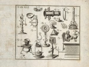 Ce compendium des savoirs théoriques et techniques en optique constitue une compilation des gravures les plus importantes illustrant les livres d'optique majeurs parus entre 1630 et 1755. Pour l'histoire de la microscopie ancienne (planches 42 à 67), le texte de Denecke offre un ensemble absolument unique à l'époque de représentations réalistes d'instruments anglais, français, allemands et italiens.