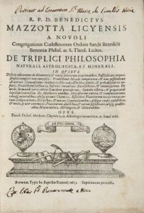 TRES RARE EDITION ORIGINALE DE CET OUVRAGE DE PHILOSOPHIE NATURELLE, dû à Benedetto Mazzota, moine de l’ordre de saint Benoît versé dans la philosophie, la théologie et les lettres, qui vécut au XVIIe siècle.