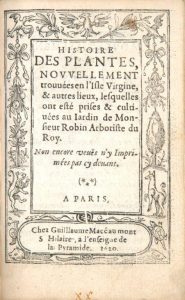 [ROBIN (Jean)]. Histoire des plantes, nouvellement trouvées en l'isle Virgine et autres lieux, lesquelles ont esté prises et cultivée au jardin de Monsieur Robin Arboriste du Roy. Paris, Guillaume Macé, 1620.