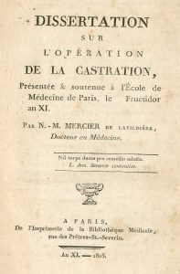 Chirurgie.- MERCIER DE LAVILDIÈRE (N.-M.). Dissertation sur l'opération de la castration, présentée et soutenue à l'École de Médecine de Paris, 1e Fructidor an XI. Paris, Imprimerie de la Bibliothèque Médicale, An XI -1803,