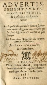 Rarissime impression parisienne du 16e s.- GUEVARA (Antonio DE).- Advertissement avx Favorits des Princes, et Doctrine de Courtisans, par lequel les Mignons des Princes se pourront donner de garde des occasions qui les font disgracier et tomber le...