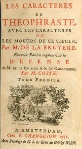 Les caractères de Théophraste. Avec les caractères ou les moeurs de ce siècle. Nouvelle édition augmentée de la défense de M. de La Bruyère et de ses caractères, par M. Coste. Amsterdam, F. Changuion, 1731,