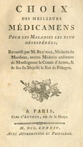 Médecine.- BUC'HOZ [(Pierre-Joseph)]. Choix des meilleurs médicamens pour les maladies les plus désespérées. Paris, Chez l'Auteur, 1784,