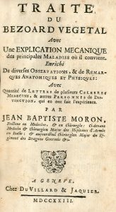 Le bézoard.- MORON (Jean Baptiste). Traité du bézoard végétal avec une explication mécanique des principales maladies où il convient. Enrichi de diverses observations, et de remarques anatomiques et physiques : avec quantité de lettres de...