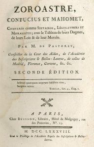 Zoroastre, Confucius et Mahomet, comparés comme sectaires, législateurs et moralistes, avec le tableau de leurs dogmes, de leurs lois et de leur morale. Seconde édition. A Paris, chez Buisson, 1788,
