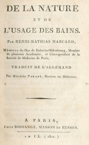 Thermalisme.- MARCARD (Henri-Mathias). De la nature et de l'usage des bains. Traduit de l'allemand par Michel Parant. Paris, Bossange, Masson et Besson, An IX (1801),