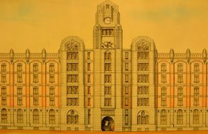 "L'Entrepôt public" (ca 1900). Encre de Chine à la plume et aquarelle sur papier. Plan de la façade du site de Tours et Taxis, avenue du Port à Bruxelles.