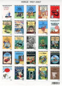 1 f. de 25 timbres spéciaux, illustrés par 24 couvertures des albums de Tintin présentées chacune dans une langue différente avec, au centre, un portrait de l'auteur. Mechelen, Poste-Imprimerie du Timbre, 2007, 1 f. de 28 x 21 cm. Etat de neuf.