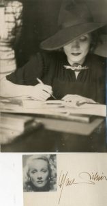 Tirage argentique rehaussé à l'encre bistre. Photo de presse : "France Presse - Société française de reportages photographiques et littéraires". Dim. : 18 x 12,5 cm (traces d'usage). Portrait de Marlène Dietrich dans son appartement parisien. On joint une petite reproduction photographique de Marlène Dietrich, signée à l'encre sépia par la célèbre star d'Hollywood. Dim. : 6 x 10 cm./ Ens. 2 pièces.