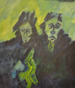 MANDELBAUM (Arié). Sans titre [Personnages]. Huile sur toile, signée au coin supér. droit, montée sur châssis et cadre en bois. Dim. cadre : 72,5 x 62,5 cm ; sujet : 68 x 58 cm. Artiste tourmenté, Arié Mandelbaum (Bruxelles, °1939)