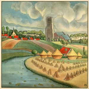 MELCHERS (Franz). "Les Meules de septembre" (1898). Lithographie originale en couleurs monogrammée dans la planche. Illustration pour le recueil de poèmes "L'An" de Thomas Braun.