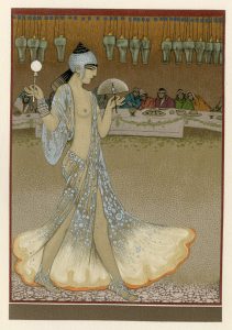 ORAZI (Manuel). "La Danse de Salomé" (1930). Gravure sur bois en couleurs tirée sur vélin de Rives, illustrant le menu du dîner de la Société des Amis du Livre moderne donné le 5 mars 1931 à l'occasion de la parution du "Salomé" d'Oscar...