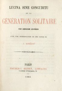 JOHNSON (Abraham).- [HILL (John)]. Lucina sine concubitu ou la génération solitaire. Avec une introduction et des notes de J. Assézat. Paris, Frédéric Henry, 1865,