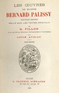 PALISSY (Bernard). Les Oeuvres de Maistre Bernard Palissy. Nouvelle édition revue sur les textes originaux par B. Fillon. Avec une notice historique, bibliographique et iconologique par L. Audiat. Niort, Clouzot, 1888,