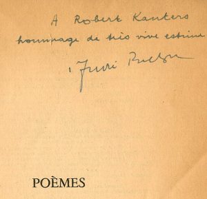 8°, br., non coupé (couv. souillée ; papier jauni). Envoi : "A Robert Kanters / hommage de très vive estime / André Breton". Edit. orig. Ex. du service de presse.