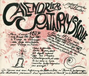 Calendrier pataphysique pour l'année 115 EP (vulg. 8 sept. 1987 - 7 sept. 1988) à l'usage de l'étranger avec page occultatrice pour l'usage en France.