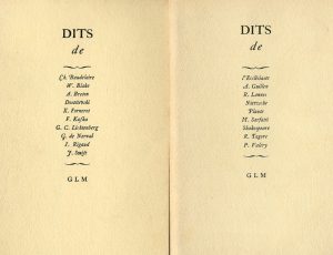 4 vol. in-16, en f., couv. rempliée. Ces "dits" ((de Baudelaire, Shakespeare, Valéry, René Char, Rembrandt, Saint Just...) ont été mis en pages et imprimés par Guy Lévis Mano. Tirages limités et numérotés.