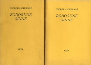 SCHEHADE (Georges). Rodogune Sinne. P., GLM, 1947, in-12, br. Tiré à 715 ex. num. 1/25 vélin du Marais, signés par l'éditeur. on joint un second ex. (1/600 vélin)./ IDEM. Poésies Zéro ou l'Ecolier sultan. Même édit., 1950, 8°, br., non...