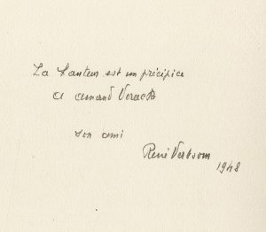 Poème calligraphié par l'auteur sur papier Cansion et Montgolfier, 11 feuillets 4° dont 3 sont vierges, sous couv., titre à l'encre au 1er plat. Ce poème est dédicacé "La hauteur est un précipice, A Amand Vereecke, son ami, René Verboom, 1948".