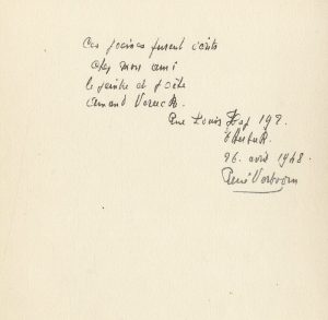 Poèmes calligraphiés par l'auteur sur papier Cansion et Montgolfier, 7 feuillets petit 4°, en feuilles, 2 poèmes sont signés par Verboom. Au 1er feuillet : "Ces poèmes furent écrits chez mon ami le peintre et poète Amand Vereecke, Rue Louis Hap 192, Etterbeek, 26 avril 1948, René Verboom".