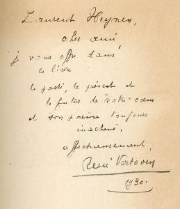 gd 8°, demi-basane brune à coins, dos à 5 nerfs, auteur, titre et fleurons dorés, couv. et dos cons. (rel. frottée). Edit. orig. Ex. sur Featherweight. Le bois de Roger Parent en couverture a été rehaussé par Verboom. Envoi : "Laurent Heynen, cher ami, je vous offre dans ce livre le passé, le présent et le futur de 'votre coeur' et son poème toujours inachevé, affectueusement, René Verboom, 1930".