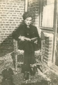 VERBOOM (René). Photographie de l'écrivain, assis dans le coin d'une cour, occupé à lire un livre.