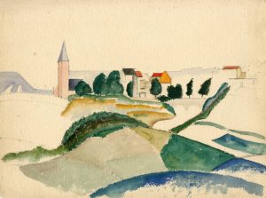 VERBOOM (René). Sans titre [Paysage : champs et village].
