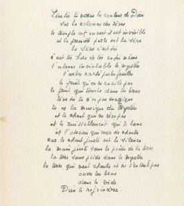 4°, sous couv., titre à l'encre au 1er plat. Au 1er f. : "Les six poèmes de ce manuscrit furent écrits le neuf octobre 1946 de six heures du matin à dix heures du soir dans une pièce exposée au nord et sans autre feu que celui de l'âme. Ces poèmes manuscrits de Dieu serez-vous là ? sont en unique exemplaire. R.V.". On joint une photocopie du brouillon perdu.