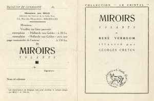 gd 8°, br., couv. en papier doré (petit accroc au 2e plat). Edit. orig. tirée à 175 ex. num. 1/150 Featherweight./ VERBOOM (René). Miroirs volants. Illustré par Gerges Creten. Brux., Edit. de la Vache folle, "Le Cristal", s.d. Rarissime prospectus de 4 p. in-12 pour ce recueil qui n'a jamais été édité./ Ens. 2 pièces.