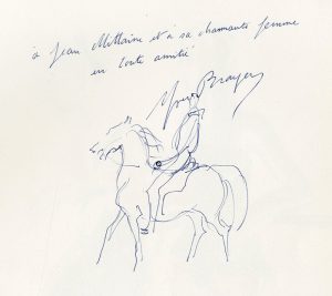 4°, en f., non paginé, sous couv. rempliée. Exemplaire avec envoi et un dessin de Yves Brayer : "à Jean Mittaire et à sa charmante femme en toute amitié. Yves Brayer". Tiré à 200 ex. num. sur vélin blanc de Rives (tirage unique). Belle édition ornée en frontispice de Danseuses, de flamants roses en bandeau, de 4 hors-texte dont 3 en double page (Arlésiennes, Venise, l''Escurial - la Provence, la Camargue) et une charrette espagnole en cul-de-lampe.
