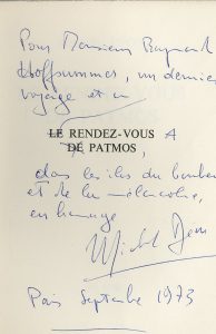 L8°, 339 p., br., non coupé. Édit. orig. tirée à 75 ex. num. 1/60 pur fil du Marais. Envoi : "Pour Monsieur Raymond / Hoffsummer, un dernier / voyage et un / [Rendez-vous] à [Patmos], / dans les îles du bonheur / et de la mélancolie / en hommage / Michel Déon / Paris septembre 1973". Bel exemplaire.
