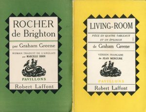 GREENE (Graham). Living-Room. Pièce en quatre tableaux et un épilogue. P., Laffont, "Pavillons", 1954, in-12, br. Edit. orig./ IDEM. Rocher de Brighton. Brighton Rock. Même édit. et coll., 1947, in-12, br. (lég. gauchis). Edit. orig. 1/100 ex....