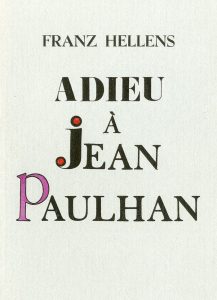 plaquette in-12, 10 p., br. Ex. enrichi d'un envoi. Edit. orig. tirée à 55 ex. num. 1/10 Hollande ornés d'un dessin supplémentaire d'Elisabeth Hellens./ IDEM. Glose sur "la Femme partagée". Même édit., 1964, plaquette in-12, 12 p., br. (pet. mouill. in fine). Edit. orig. tirée à 51 ex. num. 1/10 Hollande./ IDEM. Adieu à Jean Paulhan. Même édit., 1968, plaquette in-12, 9 p., br. Ex. enrichi d'un envoi. Edit. orig. tirée à 51 ex. num. 1/11 Hollande./ Ens. 3 vol.