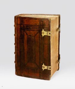 froid encadrant un rectangle central composé de deux roulettes à froid, dos orné de petits fleurons dorés, fermoirs et coins de laiton ouvragé, tranches lisses (Reliure de l'époque).