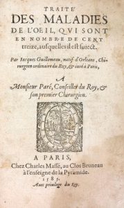 GUILLEMEAU (Jacques). Traité des maladies de l'œil, qui sont en nombre de cent treize, ausquelles il est suject. Paris, Charles Massé, 1585. Petit in-8, demi-basane marbrée, dos lisse orné, pièce de titre rouge, tranches rouges (Reliure du...