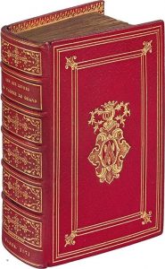 Roy Tres-chrestien. Paris, Claude Micard, 1571. In-16, maroquin rouge, décor à la Du Seuil, armoiries dorées au centre, dos orné aux petits fers, coupes ornées, roulette intérieure dorée, tranches dorées (Simier r. du roi).
