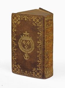 sautoir couronnées aux angles, armoiries au centre, dos lisse orné, coupes ornées, roulette intérieure dorée, tranches dorées (Reliure de l'époque).